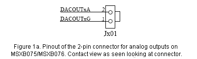 2-pin Molex headers are used for analog outputs on the following models of MSXB075 and MSXB076. The models have a front panel with BNC connectors connected to the 2-pin headers.