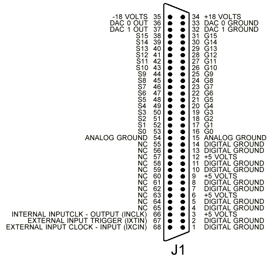 Connecting Analog Input SignalsAnalog signals are connected to the Simultaneous Sampling Board through either the 32-point quick-connect termination panel or through connector J1. Discrete wires are connected to the termination panel, and signals via a 68-line cable are connected to J1. Each quick-connect point is labeled with the signal name. The pinout of connector J1 is shown in the following diagram: