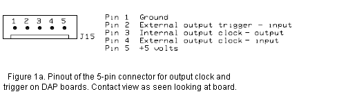 A 5-pin SIP (Molex) connector is used primarily for clock and trigger input on a-series DAP boards and some accessory boards. The connector is keyed with a 0.1" spacing. It mates with female (receptable, socket) 5-pin connector on a connecting cable.