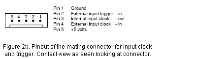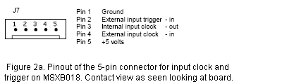 The MSXB018 has two 5-pin Molex connectors - one for input clock and trigger and the other for output clock and trigger. The connector for output clock and trigger on the MSXB018 is J8. Its pinout and that of the mating connector are the same as those for the DAP board, as shown in Figures 1a and 1b. Figures 2a and 2b show the pinout for the input clock and trigger.