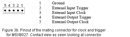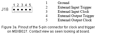 The MSXB027 has one 5-pin Molex connector for trigger and clock for both input and output. Figures 3a and 3b show the pinout for the J18 connector on the MSXB027 board and the mating connector on the cable.
