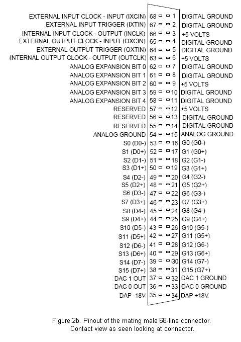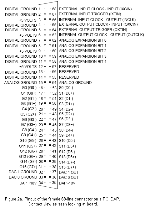 The 68-line connector on the PCI DAP is different from that on the xDAP. Figures 2a and 2b show the pinout when connecting to the 68-line connector on a PCI DAP, with the corresponding connections on the male connector on the cable.