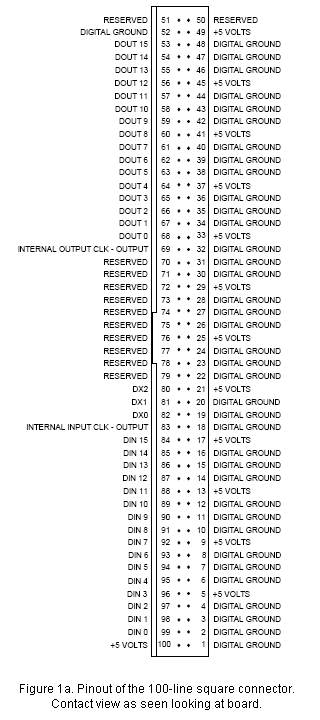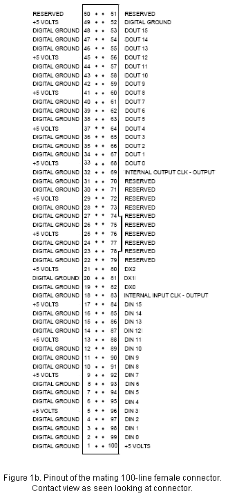The 100-line connector is not accessible from the back of the PC. It is normally accessed through a cable adapter installed in an adjacent slot. The cable adapter can be model number MSCBL076 for a D connector or MSCBL113 for a rectangular connector on a PC backpanel. Figures 1a and 1b show the pinout when connecting to the 100-line rectangular connector on a PCI DAP directly, with the corresponding connections on the female connector on the cable.